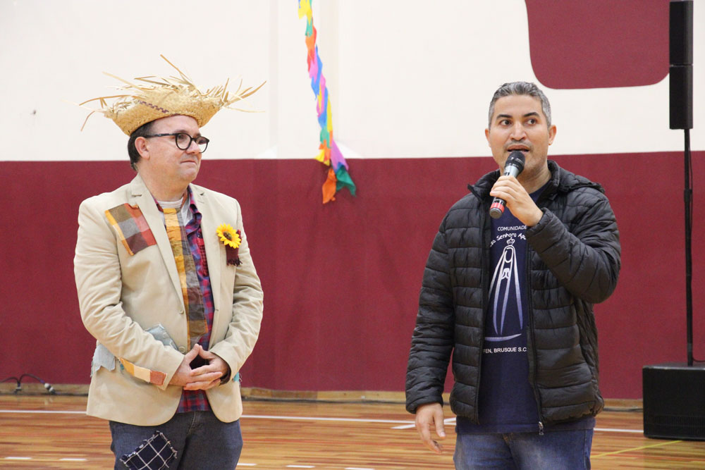 SolidariedadeEsta edição da Festa Junina teve um caráter solidário, com a doação de parte da renda para a comunidade Nossa Senhora Aparecida, no Steffen, que teve o telhado danificado com um vendaval em janeiro. Padre Silvano explica que em conversas com o pároco da Paróquia São Luiz Gonzaga, padre Hélio Feuser, surgiu a ideia de destinar algum valor à comunidade. Ele ressalta que os santos festejados em junho servem de inspiração e são exemplos de solidariedade e fraternidade. “Por que não fazer gestos de solidariedade? Durante toda a história do São Luiz, nesses 122 anos, a solidariedade sempre se fez presente. Sentindo o que a comunidade Nossa Senhora Aparecida vem passando, queremos nos solidarizar com eles. Celebramos São Pedro, São João e Santo Antônio, pessoas que não viveram para si, mas para os outros. E a festa junina do Colégio São Luiz também busca esse espírito”. Presente no evento, o coordenador do CPC da comunidade Nossa Senhora Aparecida, Éder Aparecido de Souza, fala do sentimento de gratidão pelo gesto do colégio. Ele explica que, desde o destelhamento, a igreja foi interditada e a obra de reparação terá apenas uma parte custeada pelo seguro. Por isso, a comunidade se mobiliza para arrecadar o valor restante.“Para nós é uma grande alegria receber esta doação do São Luiz, com certeza nos ajudará muito. Desde que aconteceu o vendaval, nós começamos a promover ações para angariar fundos para refazer o telhado, de forma que a comunidade possa novamente celebrar suas missas na igreja”.