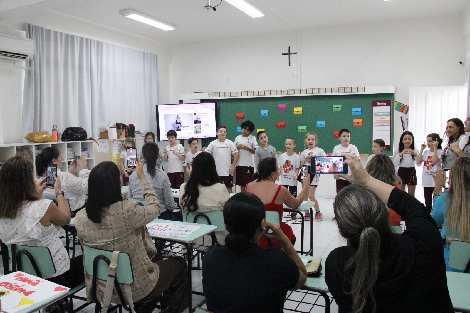 Laços fortalecidosSegundo a coordenadora da Educação Infantil, Sandra Cristini da Silva Ristow, esse momento é especial e fortalece o laço das mães com os filhos. “Foi uma semana intensa de homenagens, cheia de choro e emoção, mas foram momentos muito gostosos. Para todas as turmas eu falei que só mãe entende esse sentimento da maternidade, que não há palavras para mensurar o amor que temos pelos nossos filhos. Poder comemorar essa data junto com as mães é realmente uma benção. Nosso sentimento é de gratidão por poder proporcionar esse momento para nossos alunos, que esperam e preparam tudo com muito carinho e amor”, ressaltou. A coordenadora do ensino fundamental I, Kátia Fantini Coelho, reforçou que a homenagem é sempre um encontro de muita emoção e de grande importância. “Acompanhando a semana de homenagens, percebemos o quão importante é a presença das mães para as crianças. Então esse evento é uma pequena demonstração do amor materno, porque esse sentimento é infinito, não existe outro amor que se compare. Os filhos vão crescer, mas momentos como esse elas vão guardar sempre no coração, e a escola quer proporcionar a elas a oportunidade de criar lindas memórias de troca de carinho e amor com os filhos”, finalizou.