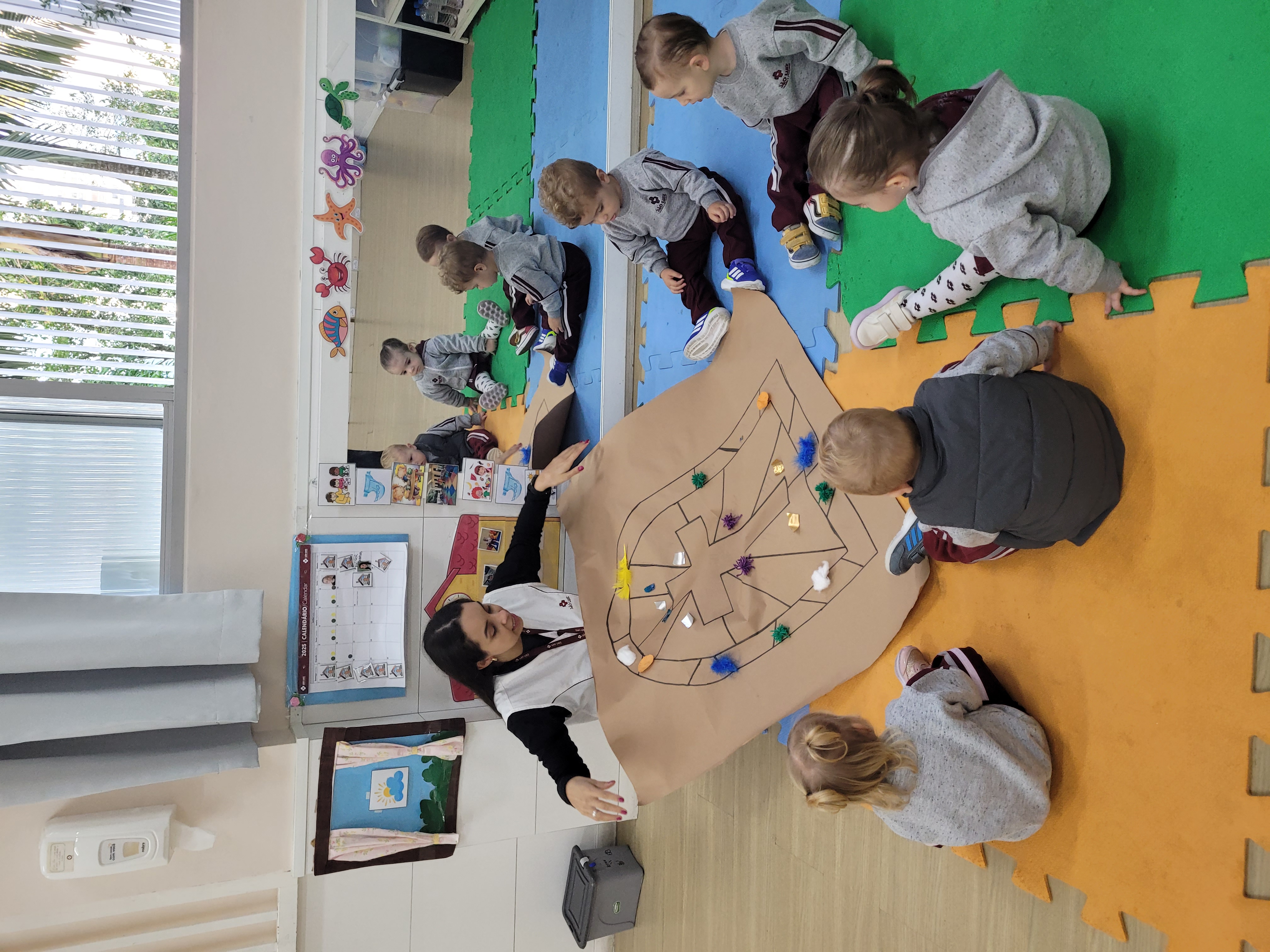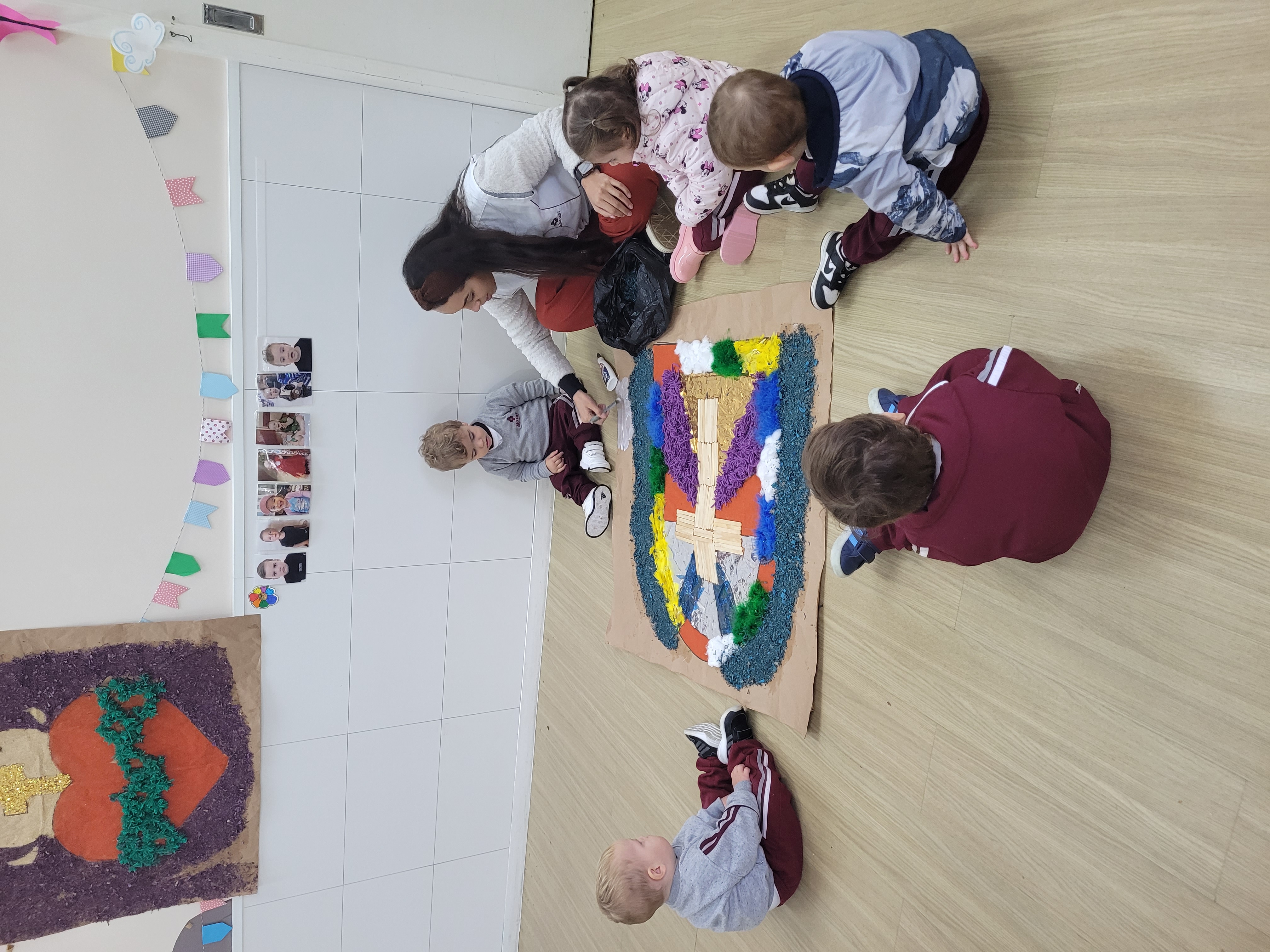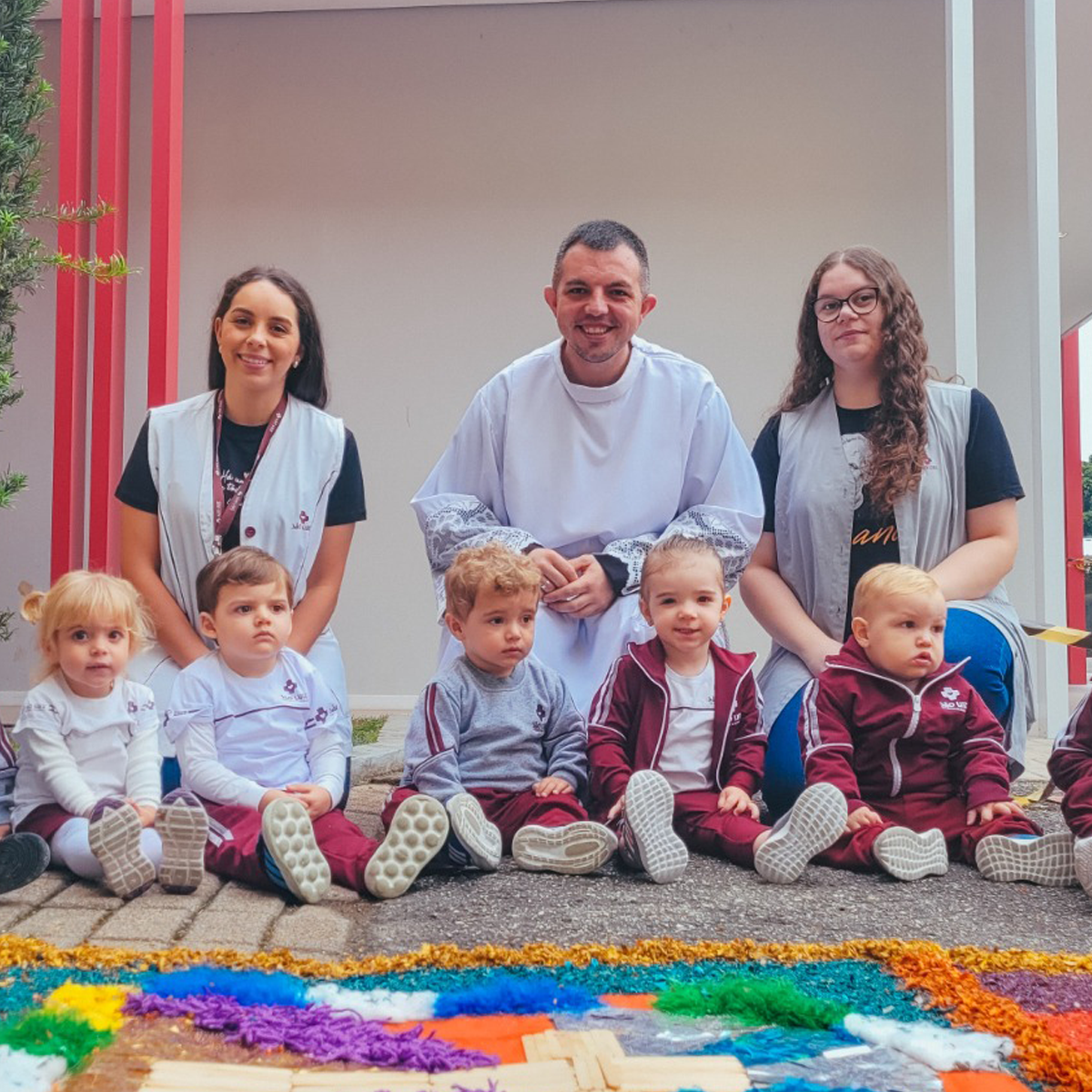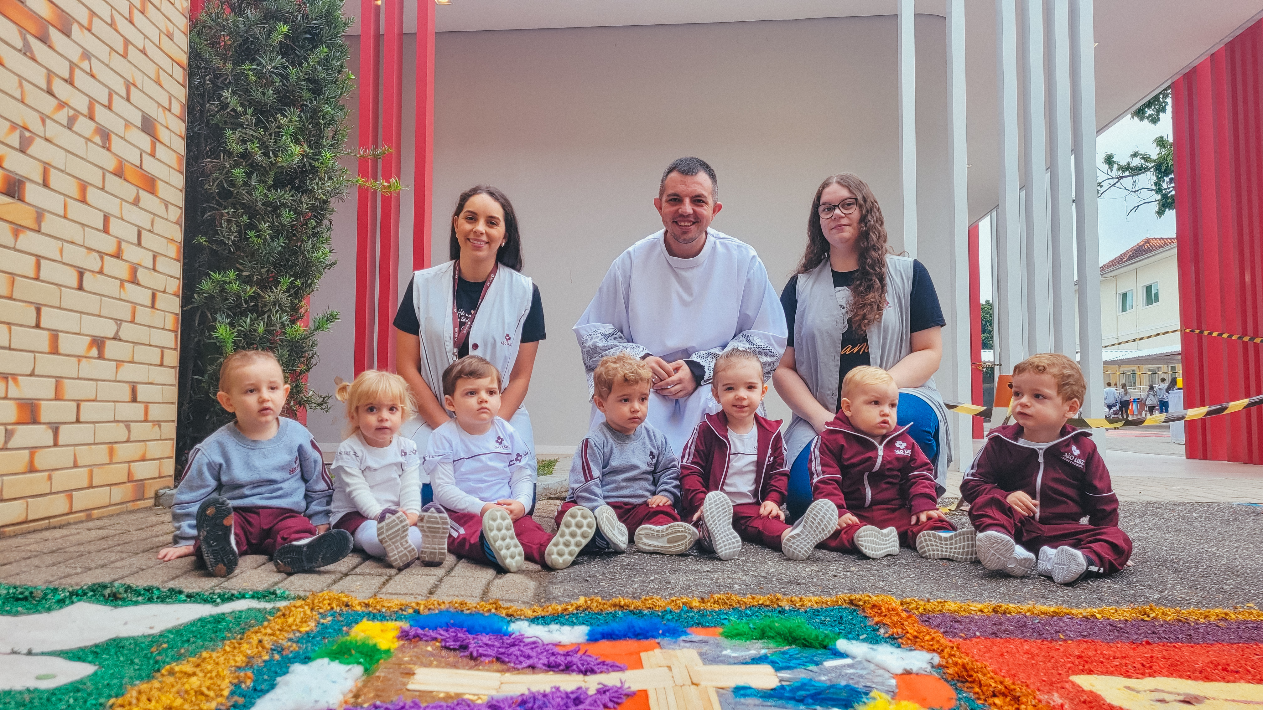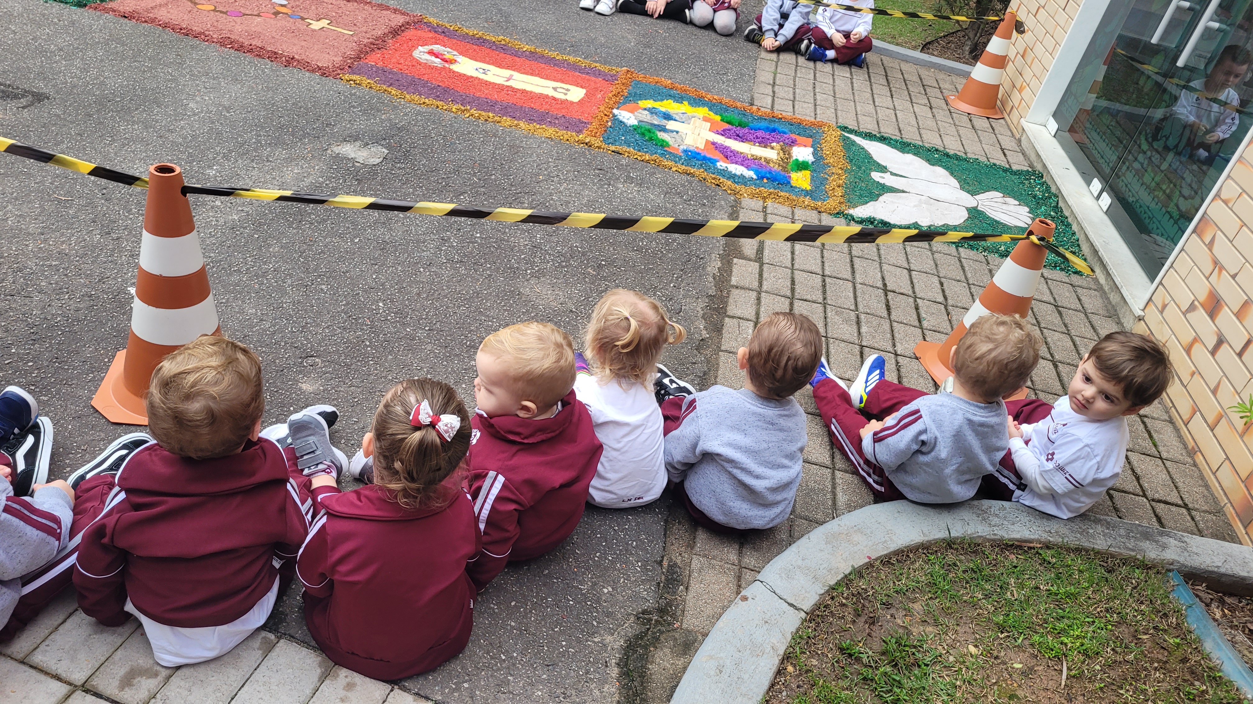 Os alunos do Maternal 2 participaram durante uma semana, da confecção do tapete de Corpus Christi. Todos os dias, as crianças participaram de uma etapa da construção do tapete, com vários materiais de texturas diferentes, proporcionando uma vivência em grupo, de texturas e trabalho em equipe.
