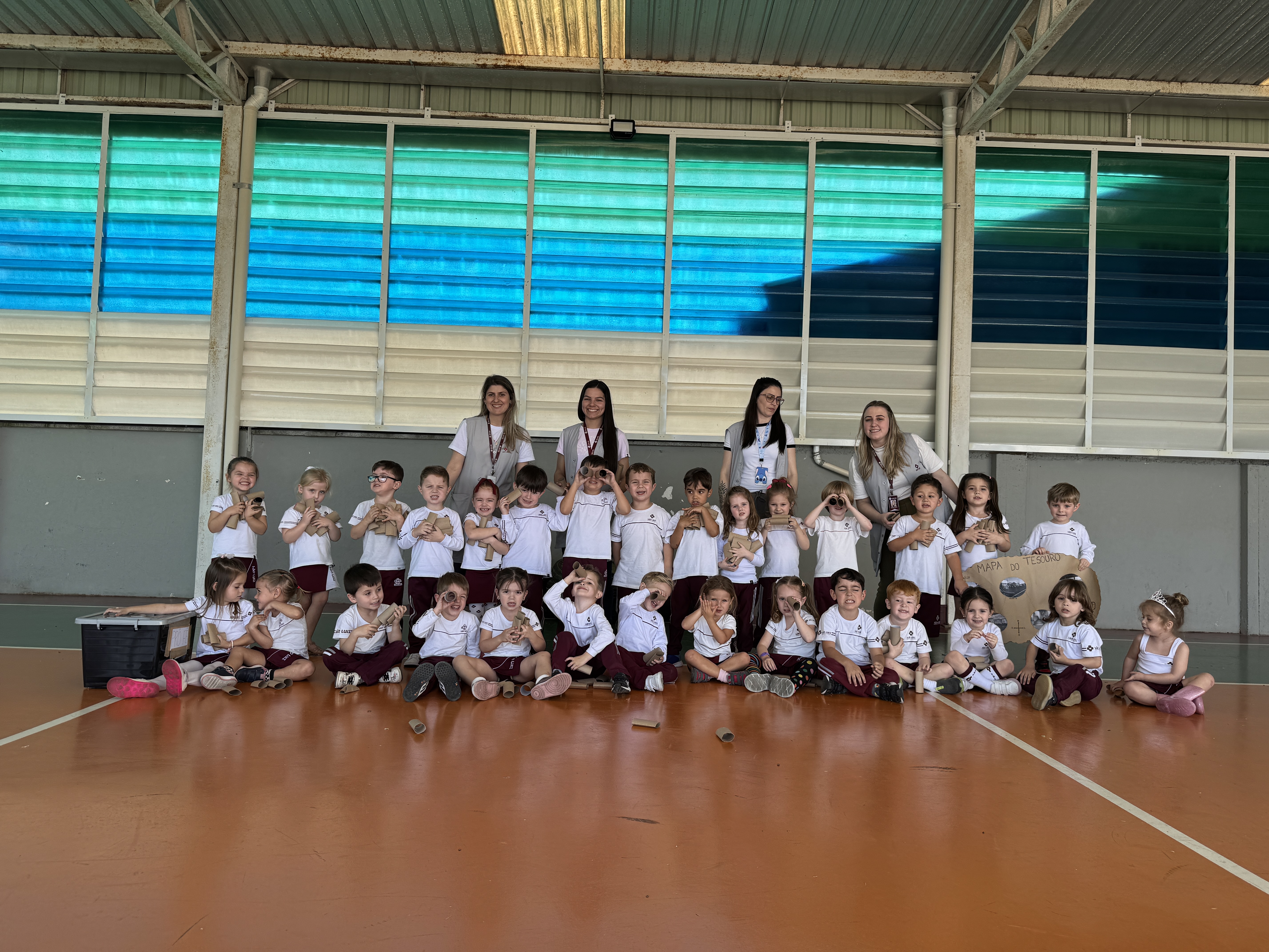 Para iniciar a unidade 6 do livro didático, as turmas dos níveis B1, B2, B3 e B4 realizaram a atividade “Rolos de papel para brincar e criar!”. A professora, Jenifer Poffo Alberton, conta que nesta nova unidade, as crianças serão convidadas a explorar as diversas possibilidades do rolinho de papel. “Elas utilizarão a linguagem oral para fazer a leitura de imagens, relatar suas criações e usar a criatividade para desenvolver elementos, despertando, assim, a curiosidade das crianças”, explicou.Na atividade de abertura da unidade, de forma lúdica, uma “caixa misteriosa” apareceu na sala de aula, com um recado escrito: “Cuidado, perigosa! Somente as professoras poderão abrir esta caixa”. As crianças ficaram curiosas para descobrir o que havia lá dentro. “As professoras abriram a caixa, e dentro havia dois elementos: um mapa e uma carta. Nessa carta, o personagem ‘Pirata Gancho’ informou aos marujos que eles teriam que seguir o mapa para encontrar o tesouro, e, quando o encontrassem, descobririam o novo objeto de estudo. As crianças ficaram muito empolgadas e seguiram as pistas. Quando encontramos o tesouro, ele estava na quadra da Educação Infantil e lá havia uma caixa com vários rolinhos para as crianças criarem e transformarem usando a imaginação”, relatou a professora.
