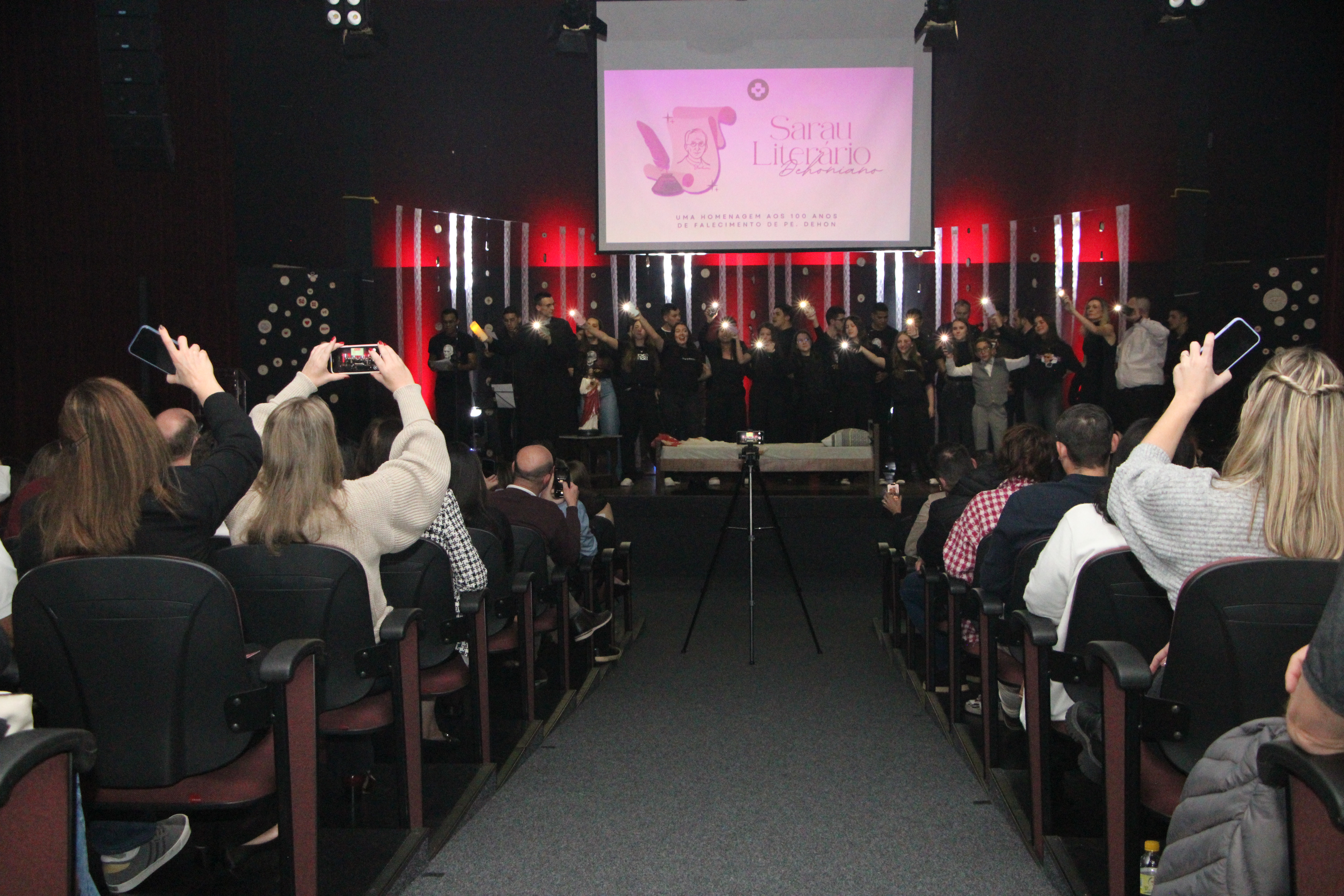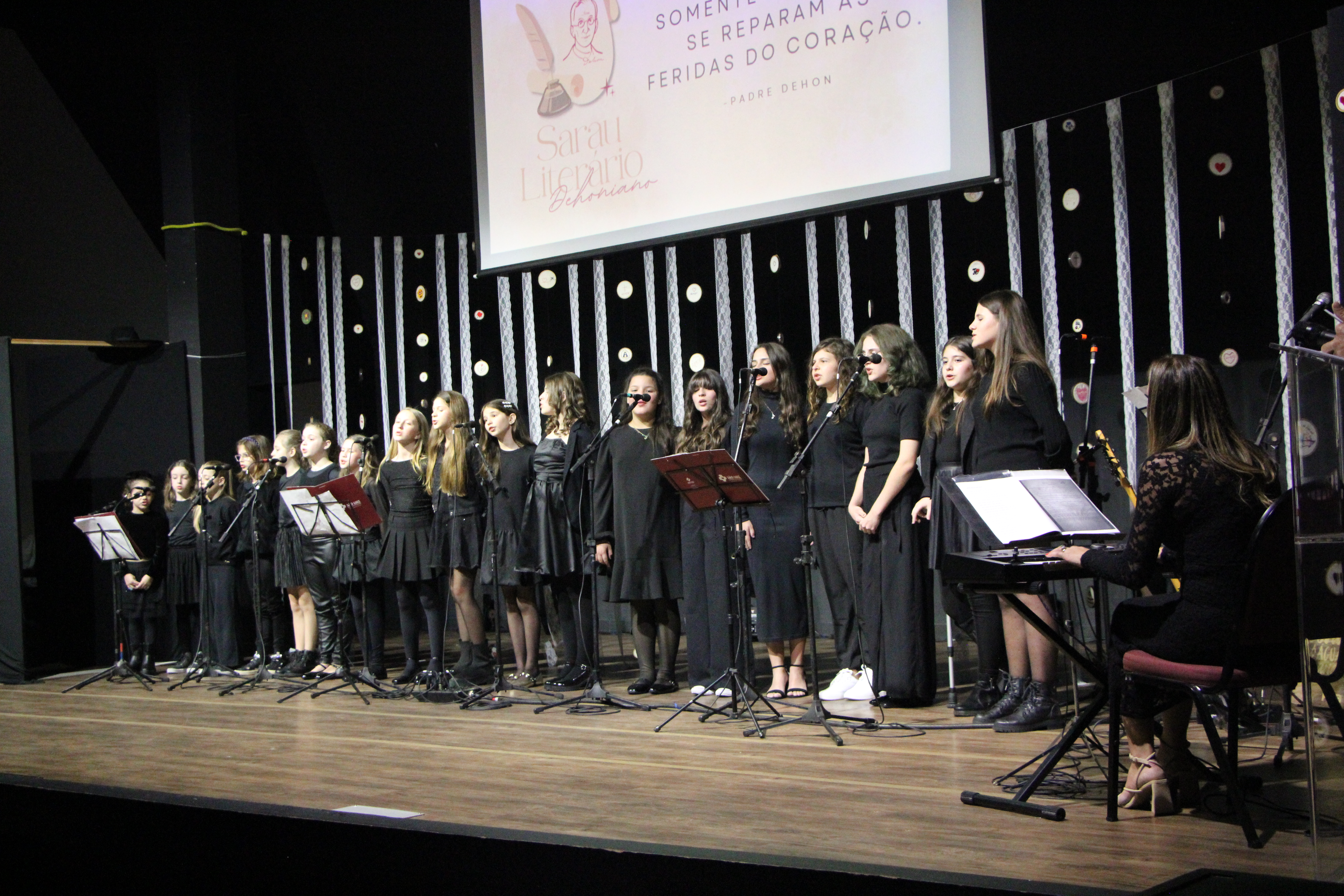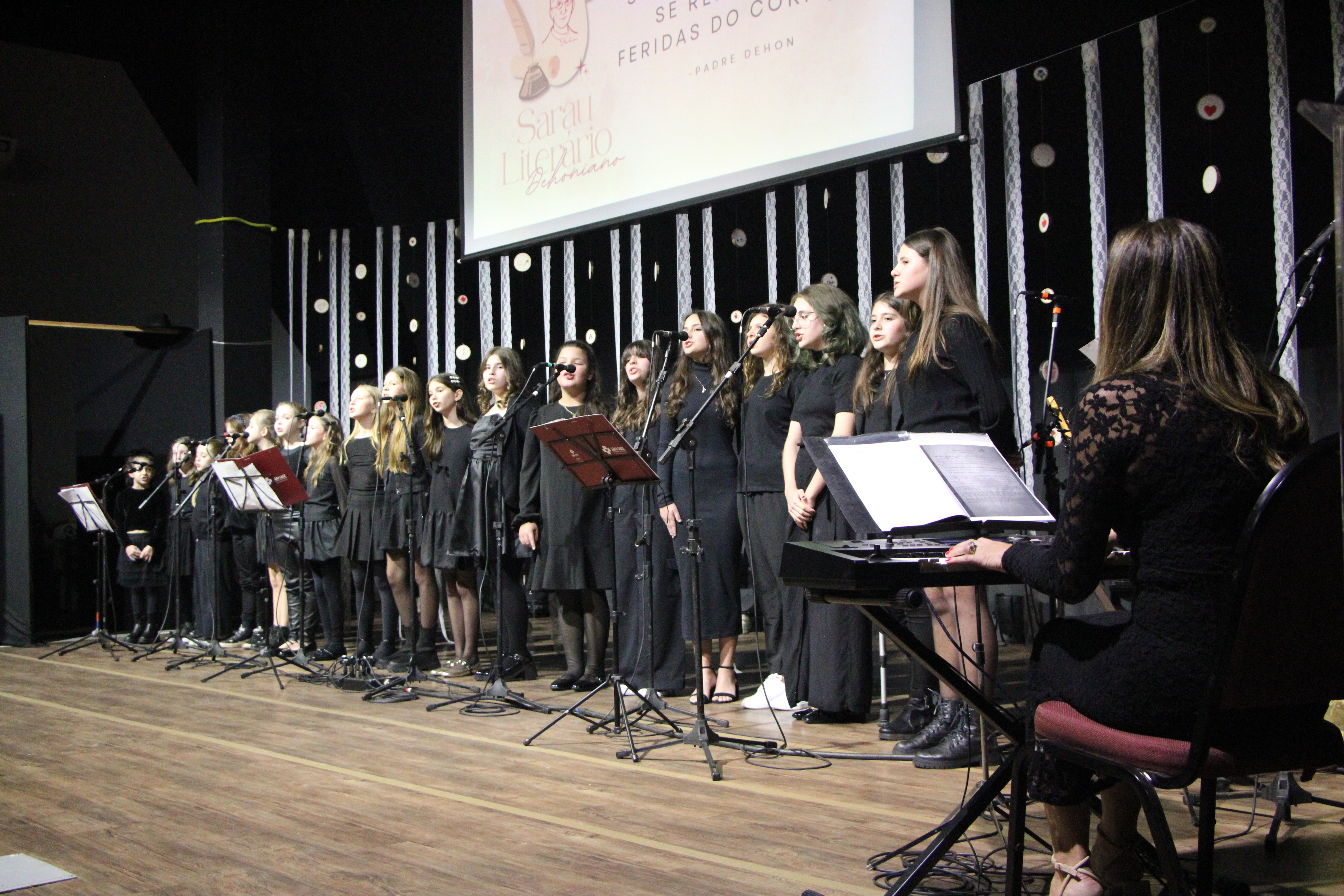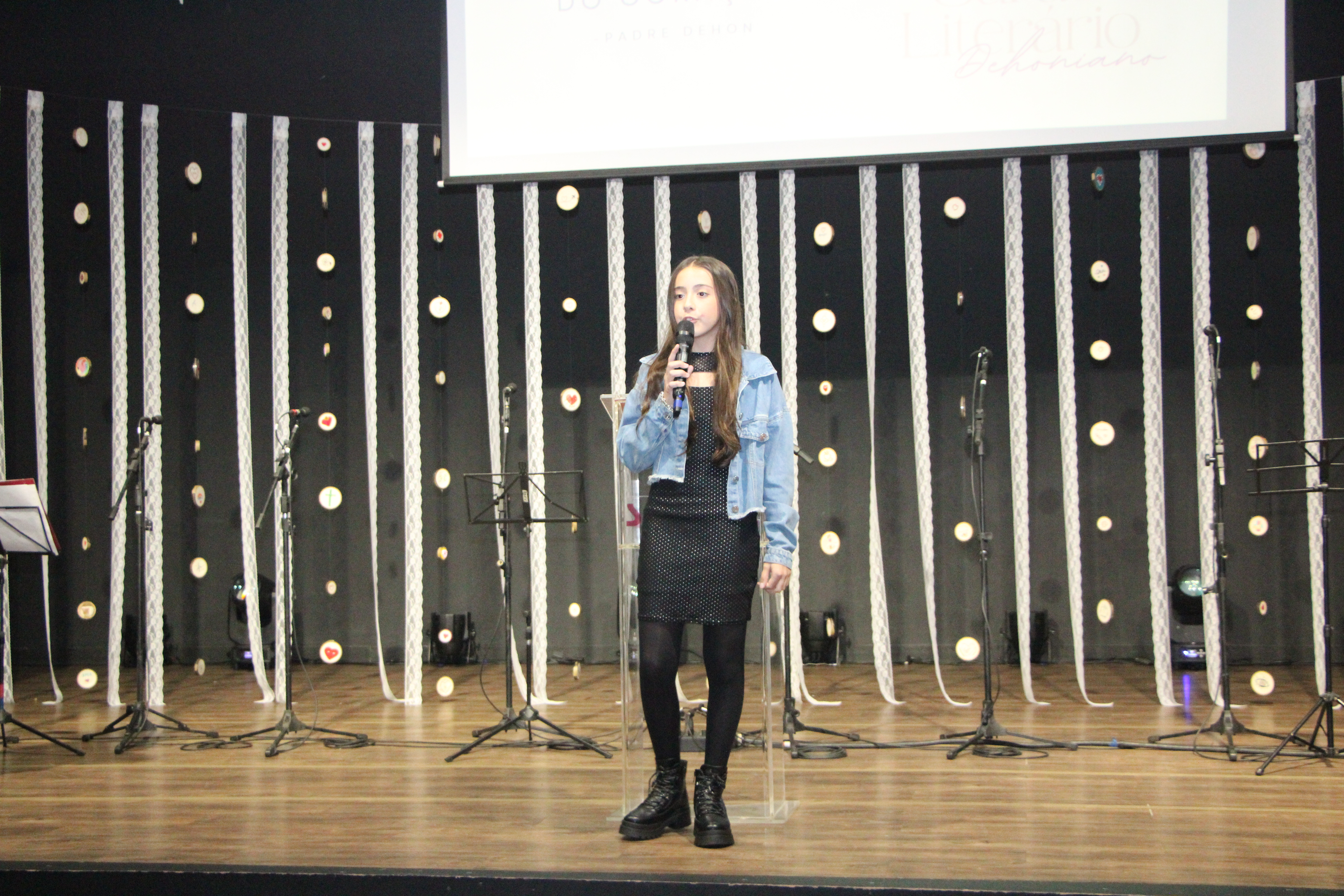 Evento construído por várias mãosA decoração do palco foi inspirada no aconchego das famílias. Durante as férias, os alunos levaram para casa um tecido para bordar, inspirados na frase “Só se vê bem com o coração”. O resultado foram dezenas de peças únicas e cheias de significado, usadas como cenário para o sarau.“O bordado remete ao carinho, à união e ao servir, valores que Padre Dehon tanto pregava”, destacou Alice Hoffmann Knhis, professora de Artes.Na música, o grupo vocal, formado por 19 crianças e jovens do 1º ao 7º ano, apresentou três canções do Padre Zezinho que retratam a simplicidade, a missão e o legado de Padre Dehon.“Além de serem belas obras, essas músicas são orações. Quando unimos arte e espiritualidade no ambiente escolar, a mensagem se torna ainda mais forte”, destaca Jenifer Prette Jorge, professora de Música.As professoras Kalinka de Souza e Deise Montagna, em parceria com a biblioteca, foram as responsáveis pelo concurso de poesias que envolveu os alunos do Ensino Fundamental II.“O padre Silvano sempre sonhou com um festival de poemas, e conseguimos unir esse desejo à comemoração dos 100 anos da morte do fundador da Congregação. Os alunos ouviram a história de Padre Dehon contada pelo frater Cristiano, que se caracterizou como ele, e, inspirados por esse momento, escreveram seus próprios poemas”, contou Kalinka.“Foi tudo feito em sala de aula, no impulso criativo do instante, e o resultado é emocionante”, completou Deise.O frater Cristiano Schneider, coordenador da Pastoral, também foi responsável pela peça teatral apresentada na noite.“Tudo foi preparado com muito carinho. O teatro revela talentos, aproxima os alunos da história da Congregação e transmite o amor que Padre Dehon tinha pelo Sagrado Coração de Jesus”, afirmou.Representando o Superior Provincial da Congregação, padre Anísio José Schwirkowski ressaltou o valor do evento.“É louvável ver nossas obras educativas reconhecendo Padre Dehon não apenas como religioso, mas como alguém que contribuiu para a sociedade. A arte toca diretamente o coração e garante que essa memória permaneça viva”.