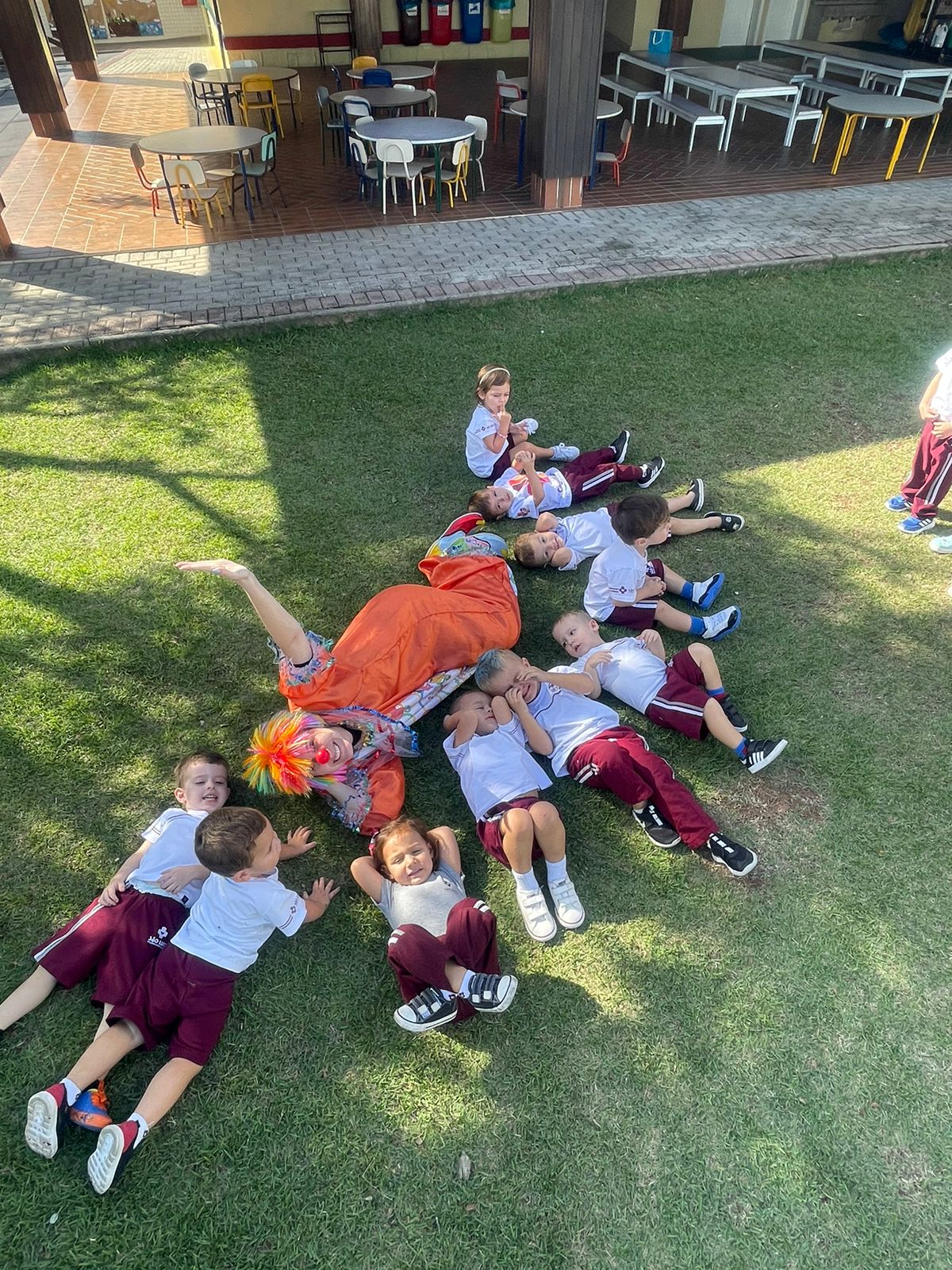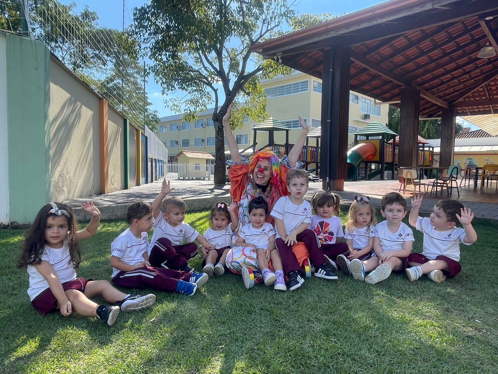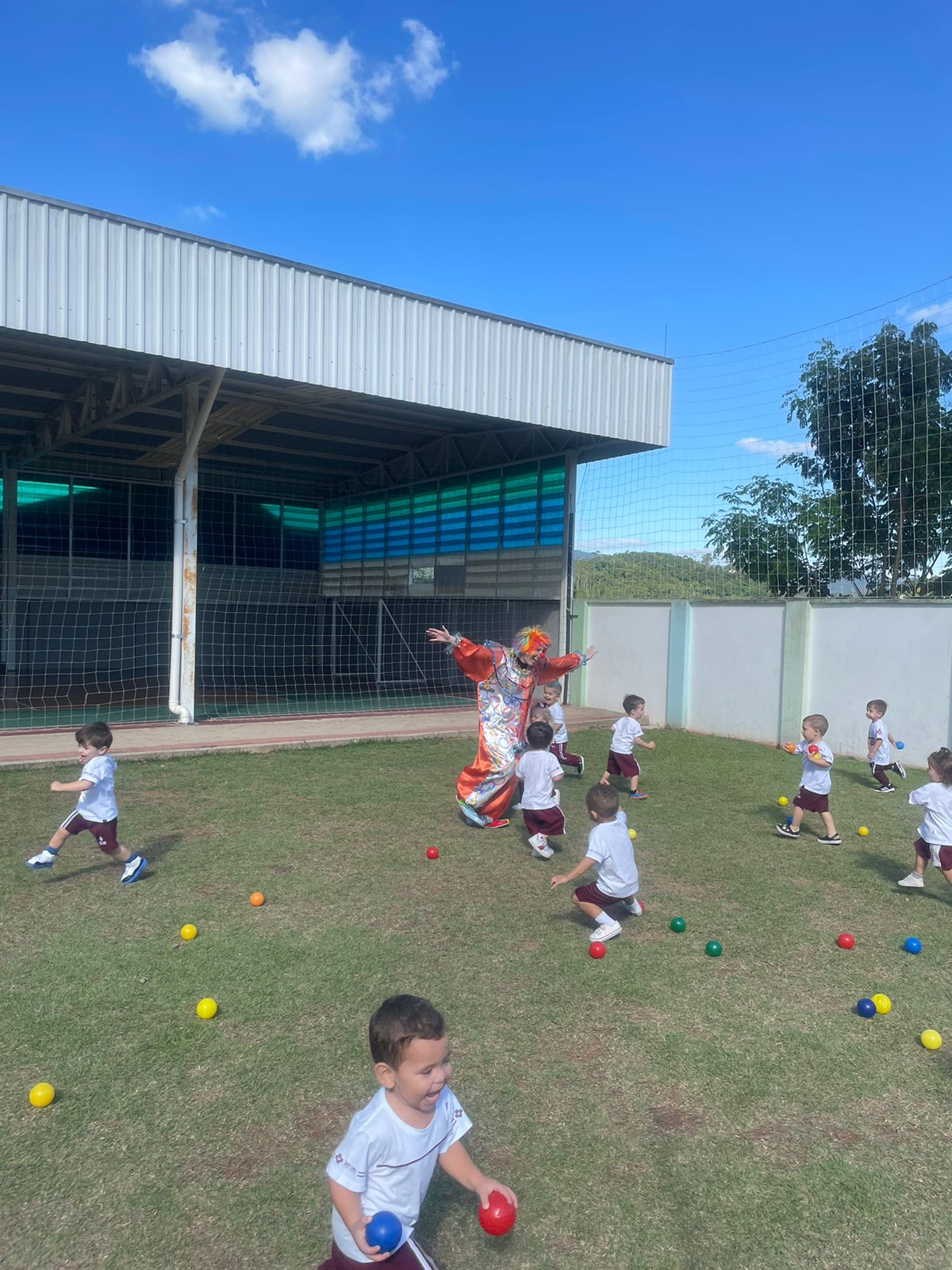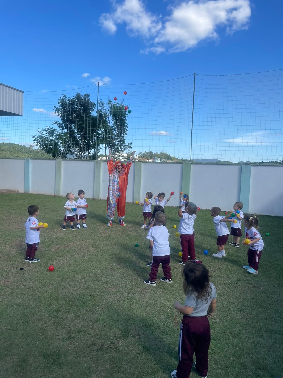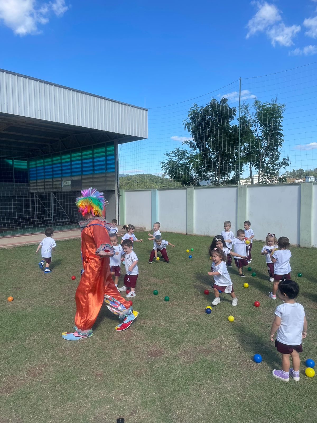 Como forma de iniciar a unidade 3 do livro didático os alunos do nível A participaram da atividade “Hoje tem brincadeira? Tem sim senhor!”, no campinho da Educação Infantil. Segundo a professora Bruna Rezini, a atividade proporcionou um momento lúdico para as crianças descobrirem o mundo do faz de conta. “Foi desenvolvido com o intuito de estimular o lúdico das crianças. Elas participaram com alegria e entusiasmo e conseguiram alcançar os objetivos propostos”, falou.Além disso, ainda como atividade referente a unidade 3, os estudantes participaram do “Faz de conta de palhaço de circo”. A proposta foi de que as crianças vivenciassem jogos e brincadeiras que desenvolvessem o trabalho em equipe e que se expressassem por meio de linguagens como a do desenho, da música, do movimento corporal, do teatro.“Diante do faz de conta de circo, as crianças foram convidadas a conhecer o palhaço e desde o início adoraram esse personagem do circo, que é super divertido. Para explorar ainda mais esse contato com o personagem, além das atividades e brincadeiras que já estávamos realizando, elas foram convidadas a virem de casa vestidas com roupas coloridas e adereços que remetiam a figura do palhaço. Brincamos juntos de circo e de palhaço e registramos esse momento com muitas fotos”, falou a professora Camila Pianezzer.