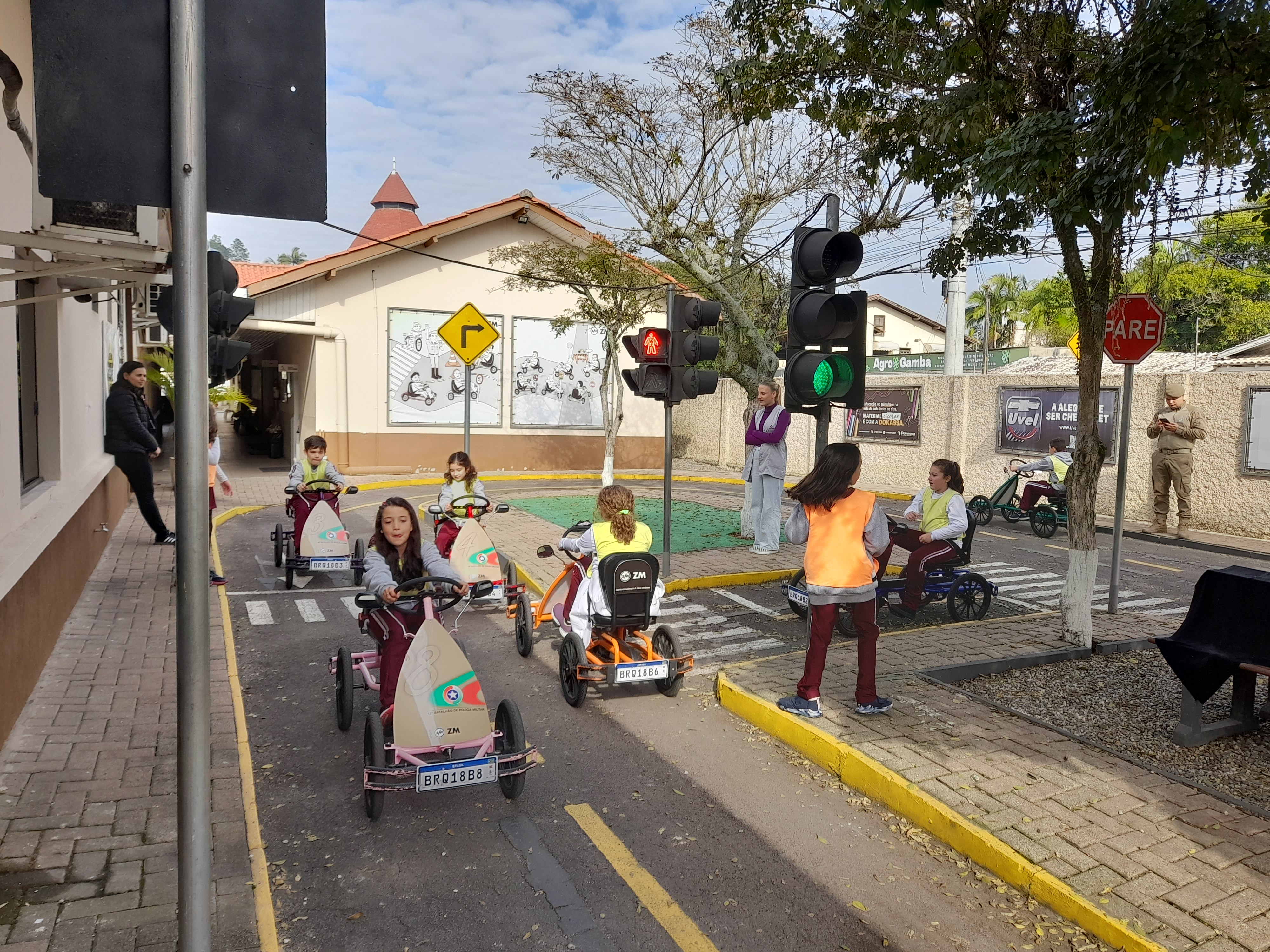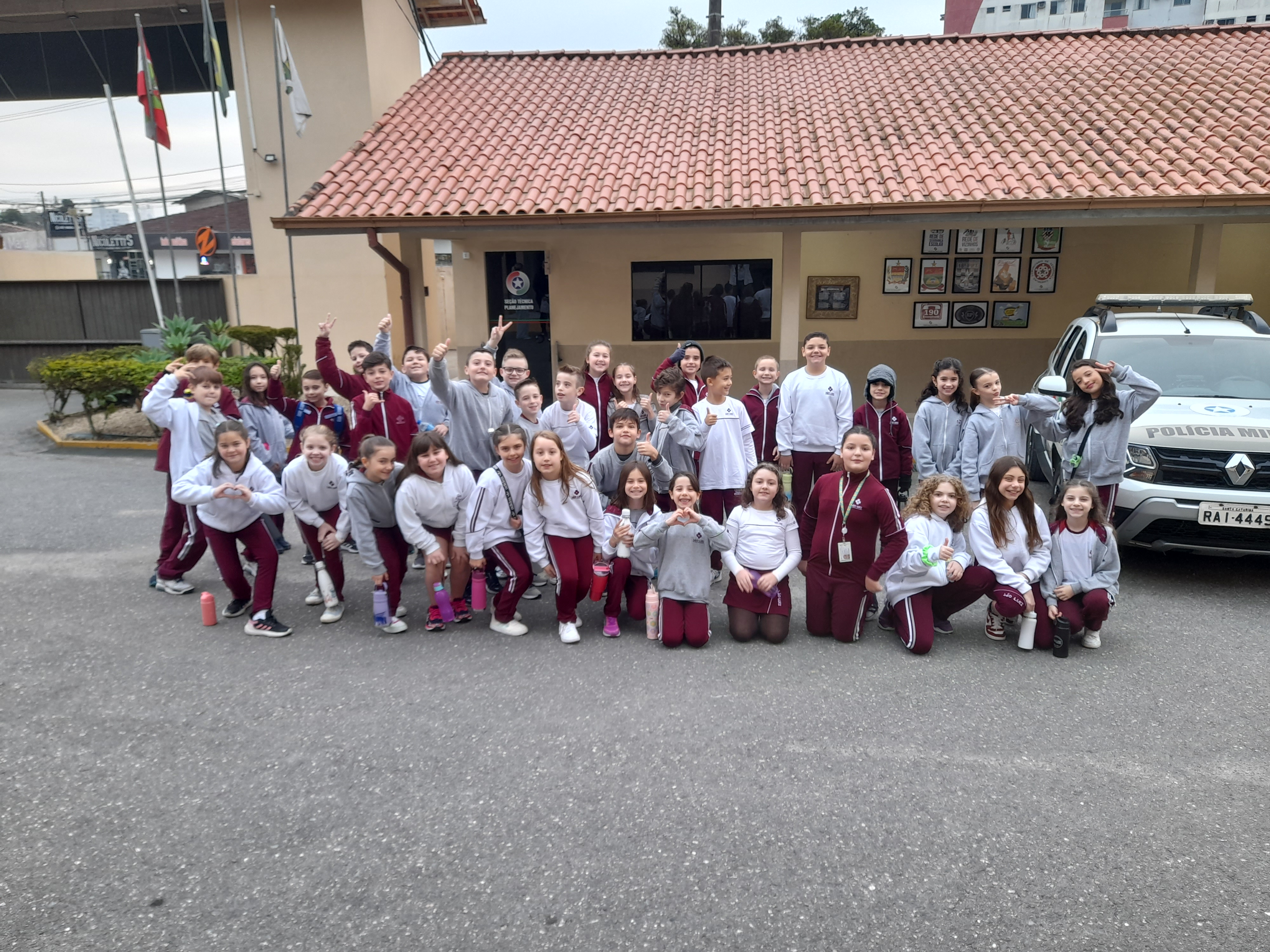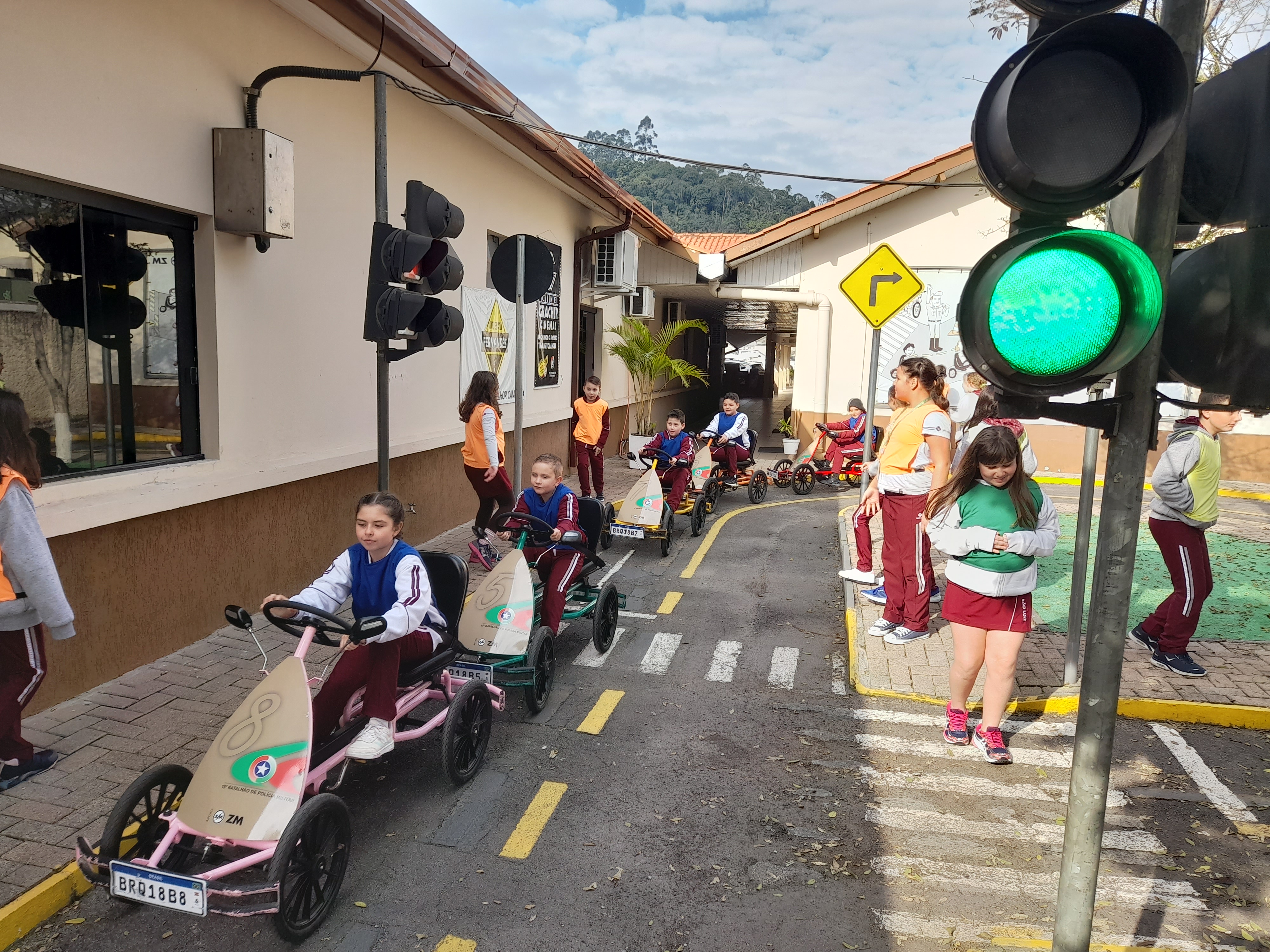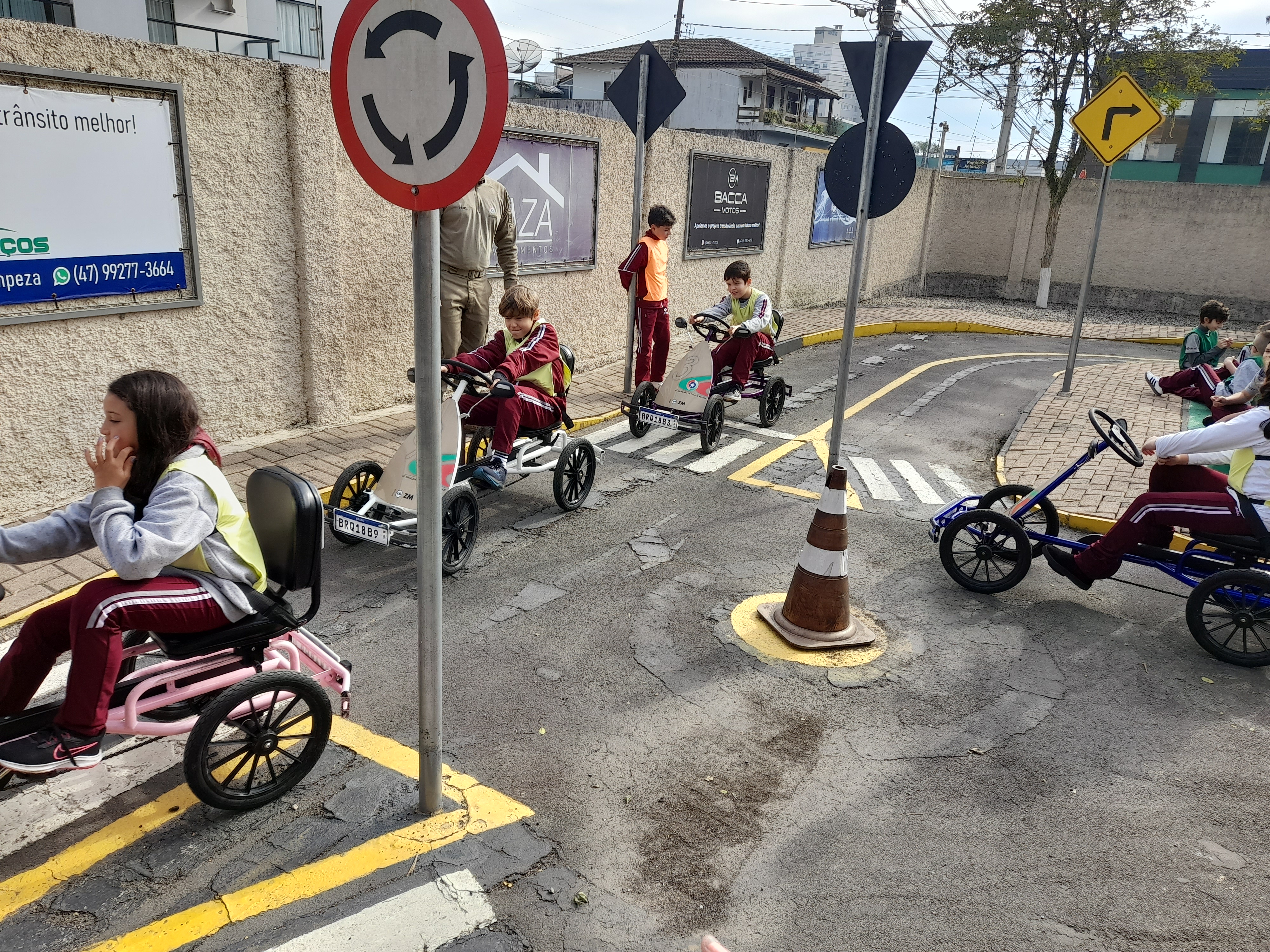 Os alunos dos 4º anos participaram do projeto Transitolândia, da Polícia Militar em parceria com a Guarda Civil. A professora, Julliana Rodrigues, conta que as crianças participaram de uma palestra sobre trânsito, quando foram discutidas e apresentadas as formas e comportamentos adequados para pedestres e motoristas. “Ensinamentos sobre como se deve atravessar a rua, o respeito aos pedestres, a importância do cinto de segurança, entre outros conteúdos foram abordados, seja na condução de pedestre, motorista ou passageiro”, afirma a professora. Depois da orientação teórica, os estudantes conheceram o Centro Vivencial de Trânsito, um espaço dentro do quartel que simula as ruas de uma cidade, com toda sinalização necessária, incluindo semáforos, travessias elevadas e ciclofaixas. Era hora de colocar em prática o conhecimento recebido!“Enquanto uma parte da turma dirige carrinhos de pedal, semelhantes aos automóveis de verdade, os demais caminham pelas calçadas, se comportando como pedestres”, explicou Juliana. Segundo ela, ensinar regras de trânsito para as crianças é muito importante tanto para a segurança quanto para a formação de cidadãos conscientes e responsáveis.